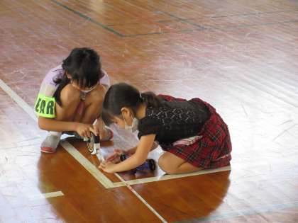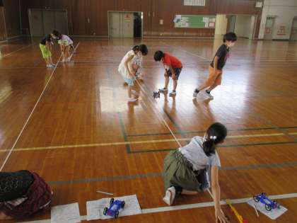 理科では、実験を行いました。風やゴムの力を使って、車を走らせる実験です。今日は、ゴムを伸ばす長さが長くなると、車が動く距離はどうなるか調べました。算数で学習した巻き尺を使い、距離を測りました。
