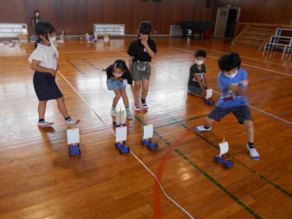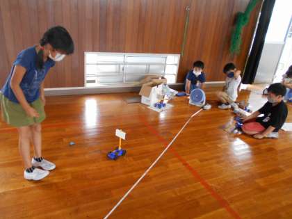 理科「風やゴムで動かそう」では、一人一人がマイカーを持って実験しています。今日は、送風機の強弱を変えて、車の進み具合がどう変わるかを調べました。
