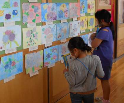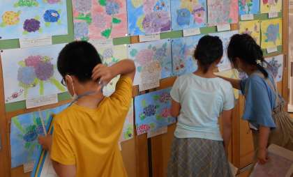 友達の描いたアジサイや空等を見て、水彩の色遣いのよさを感じ取っていました。