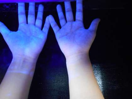 子供たちは、時間をかけて丁寧に手を洗っているつもりではいましたが、ブラックライトに手を当てて汚れが取り切れていない部分を確かめました。