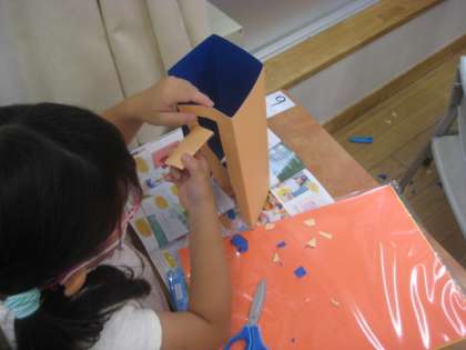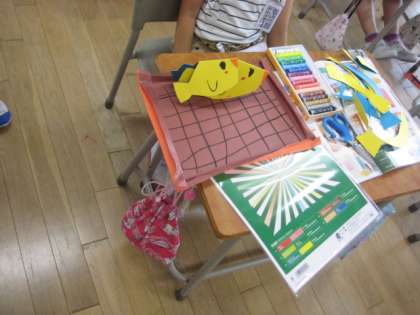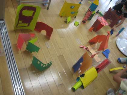 今日の図画工作科は、「おってたてたら」をしました。カラードフォルムを使い、それを立たせるためにはどうするか考えました。折ることで紙が立つことに気付き、立たせた紙で、自分たちの町を作っていました。