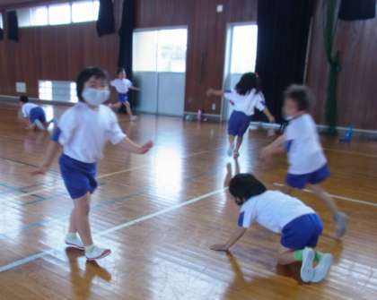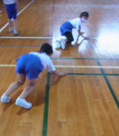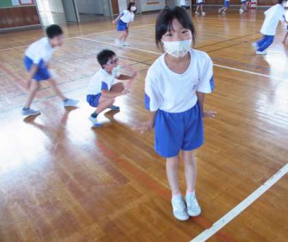 体育科の学習では、いろいろな生き物になりきって体を動かす活動をしています。海の生き物になりきる時間には、ペンギンやカメ、魚、リュウグウノツカイ等いろいろな生き物になるアイディアが出てきました。ペンギンの歩き方を真似したり、カメが泳ぐ様子を両手足を使って表現したりするなど、全身を使って工夫しながら動いた子供たちです。