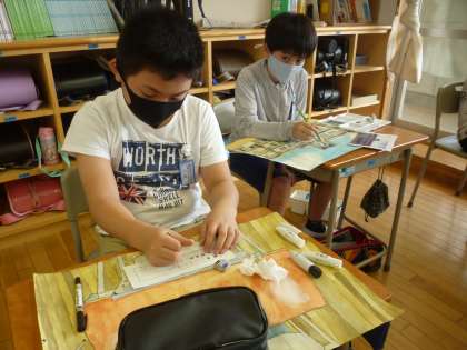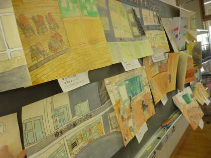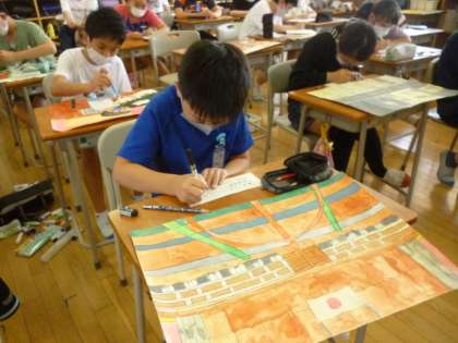 校舎や教室など、自分の思い入れのある風景を選び、絵で表現しました。「友達と一緒にドッジボールをした体育館。またドッジボールしたいな」「小学校生活の最後に使っている教室の机。みんなで勉強できて楽しい!」絵について尋ねると、どの子も素敵なストーリーを聞かせてくれました。