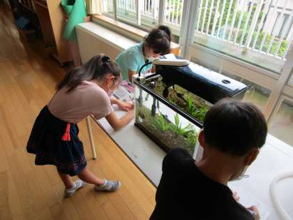 学校で育てている野菜や熱帯魚を丁寧に観察しました。水槽をいろいろな方から見たり、トマトをさわったりしてメモをとり、メモから観察したことを記録する文章を書きました。