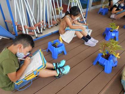 子葉が枯れてなくなっていることや、茎がとても太くなっていること、茎と葉の間から小さなつぼみがあることなど、以前観察したホウセンカとの違いを発見しました。