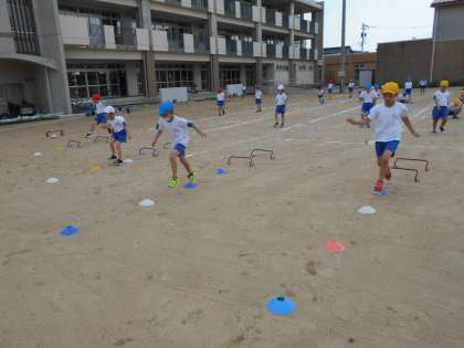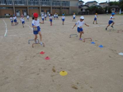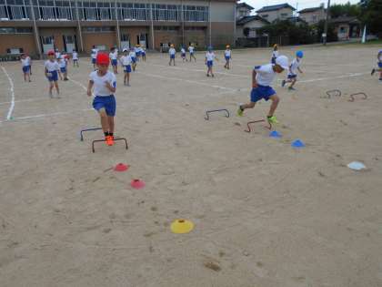 今日の体育は短距離走でした。走路に置いたミニハードルやミニコーンをリズムよく跳び越え、ゴールを目指します。腕の振り方や走る時の目線を意識して、これまでも短距離走の練習を繰り返してきました。「走るのが速くなったかも!」と成長を実感している子供もいるようです。