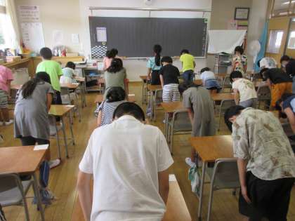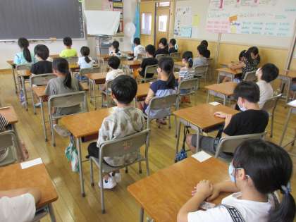 密集を避けるため、教室で校長先生の話の放送を聞く形式の始業式でした。気持ちを新たに、姿勢を正し、静かに校長先生の話を聞く子供たちでした。