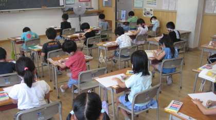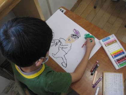 図画工作科では、国語科で学習した「おおきなかぶ」「おむすびころりん」の2つのお話から1つ選び、心に残った場面を、様子を想像しながら描きました。