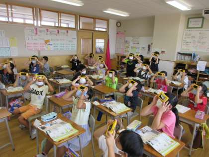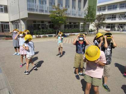 遮光プレートを使い、太陽の観察を行いました。思っていたよりも太陽が小さく見えたようで、驚いていました。自分たちのかげは、太陽と反対側にできることに気付きました。