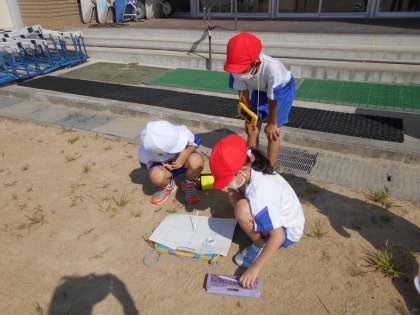 理科で、太陽とかげの向きについて実験をしています。「本当に太陽は動いている!」「かげの向きも変わった!」と、発見したことを話していました。