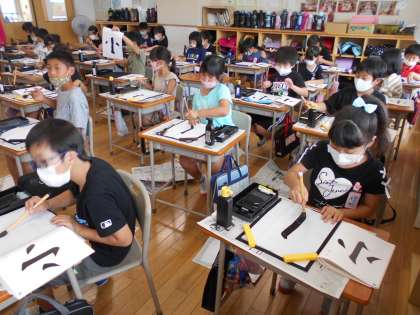 今日の習字では、「小」という字を清書しました。みんな真剣に書きました。