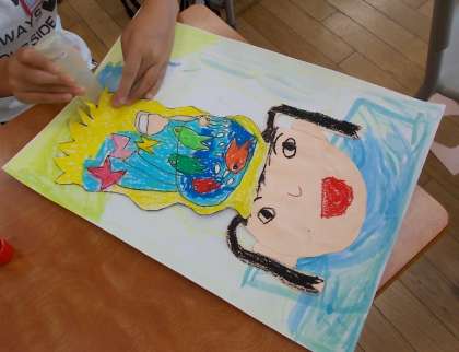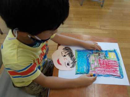 図画工作科で「ミリーのすてきなぼうし」の物語の世界を楽しみました。主人公のミリーのように、自分だけのすてきなぼうしを想像しました。「ジャングルぼうし」「魚いっぱいぼうし」等をかぶった自分の顔を、出かけたい場所のイメージを描いた絵に貼りつけました。想像することってすてきだなあと感じた子供たちでした。
