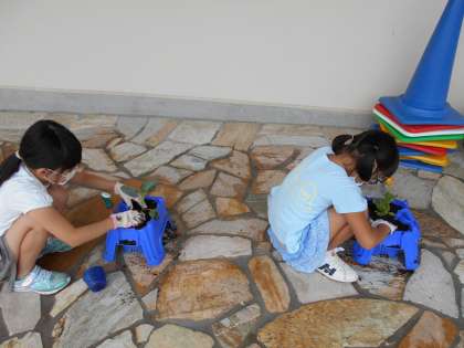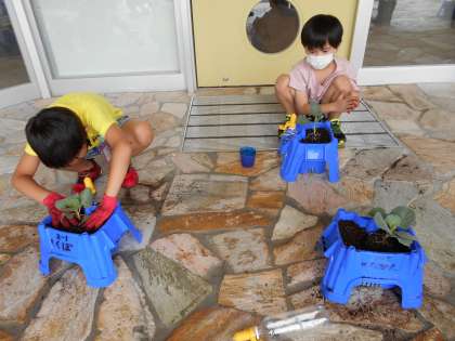 2年生は、生活科の学習で秋野菜を育てます。今日は野菜の苗が届き、鉢に植え替えました。優しく苗を持ち丁寧に植えたり、水をたっぷりあげたりするなど、「大切に育てよう」という思いが伝わってきました。