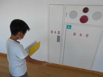 3年生の社会科では、消防や防災のしくみについて学習を進めています。学校にある消火器や消火栓、防火扉・防火シャッターの役割を学び、実際に探しました。