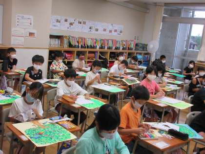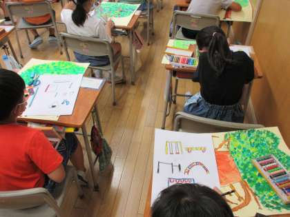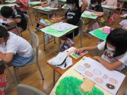 図工の作品が、だんだん仕上がってきました。水彩での色付けを終え、いよいよ木になる実や登場する人物を作っています。子供たちの発想には驚くばかりです。どのような作品になるのか、とても楽しみです。