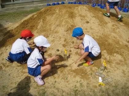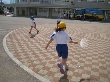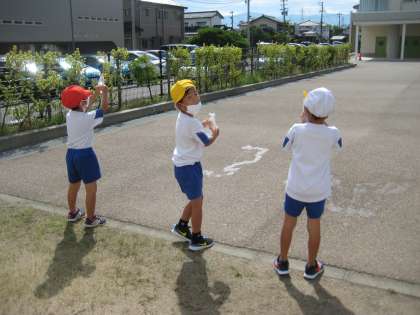 生活科の「あそびにいこうよ」で、水遊びをしました。水鉄砲やシャボン玉、泥団子づくりを楽しみました。