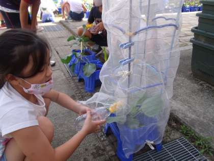 「葉っぱが大きくなってる!」「くきが太くなってる!」と野菜の成長を実感する子がいる一方で、「虫に食べられるかもしれない」など、今後のことを考え、心配する子もいました。