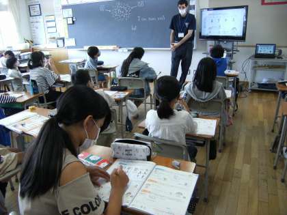 ALTの先生の発音の仕方を真似しながら、友達や先生にできること、できないことを聞き合いました。積極的に発音練習に取り組む様子も見られ、外国語に親しみながら楽しんで学習しています。