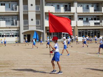 玉入れの入場です。誘導旗を掲げて、一列に並び入場しました。