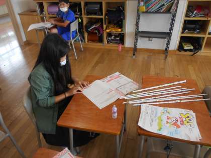 新聞紙やチラシを細く丸めて棒状にしています。小さく丸めることで丈夫な棒を作りました。来週はできた棒をつなげて、様々な形を作ります。