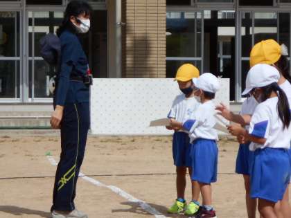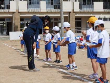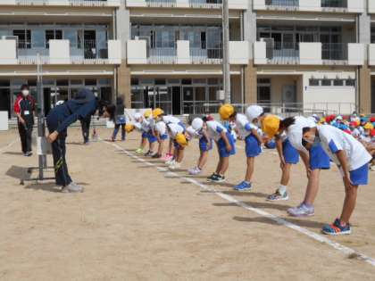 玉入れの総合優勝は、黄団と白団でした。各クラスのリーダーが前に出てきて、うれしそうに賞状を受け取っていました。みんなで、拍手で健闘を讃えていました。