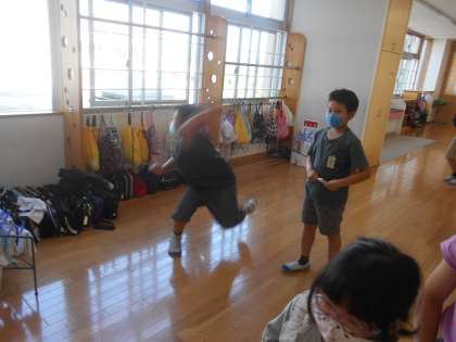 投力アップを目指して、休憩時間に紙鉄砲に取り組んでいます。チラシを使って折り、「パン!」とできるだけ大きな音が出るように腕を振ります。
