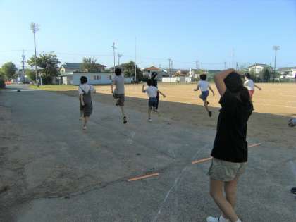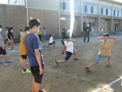 毎朝、子供たちは、自分の記録を少しでものばそうと練習に励んでいます。グラウンドでは、ステップをして身体をほぐしたり、短い距離を走って走る姿勢を見直したりと、それぞれの課題に向けて頑張っています。
