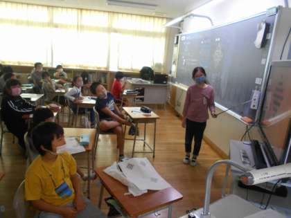●の数を1つの式に表して、簡単に求められるように工夫して計算しました。自分の考えをワークシートに書いて実物投影機で写し、みんなに分かるように説明しました。