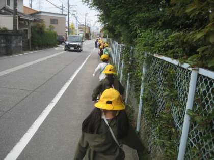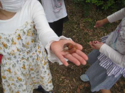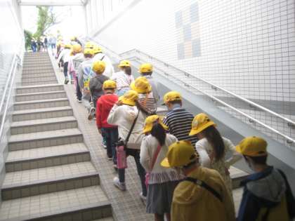 交通安全に気を付けながら公園まで歩きました。途中に地下道も通りましたが、静かに通りました。公園では、木の実を見付けたり、遊具で遊んだりしました。