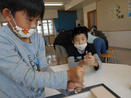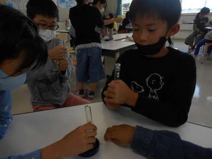 試験管の口に石けんを付け、手で握って温めると、石けんの膜がどうなるかを実験しました。子供たちは、温度と空気の関係を探りながら膜が膨らむ様子をよく観察していました。