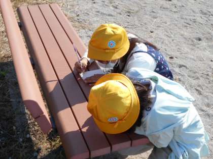 最初に向かった場所は「藤木東公園」です。広い公園の中には、遊具やベンチ、石碑等どがあり、持ってきたメモ帳に見付けた物や気付いたことをたくさん書いていました。天気も良く、思いっきり体を動かして遊ぶことができ、笑顔いっぱいの子供たちでした。
