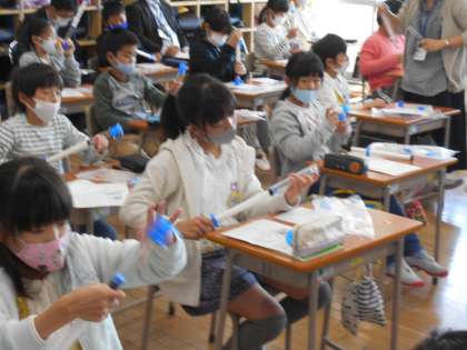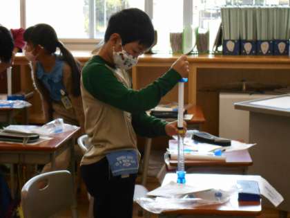 閉じこめた空気を押し縮めるとどうなるかを学習しました。まず、考えを予想した後、考えを友達と交流し、実際に空気鉄砲に空気を閉じこめて押してみました。空気を押すと体積が小さくなり、体積が小さくになるにつれて手ごたえが大きくなることを実感していました。