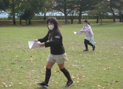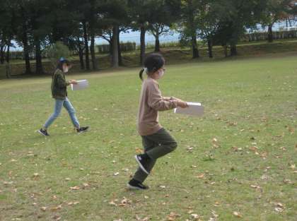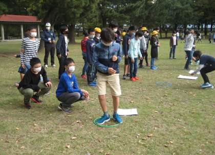 学年活動「ぐるぐるピンポンリレー」(障害物リレー)の様子です。笑顔で楽しく取り組みました。