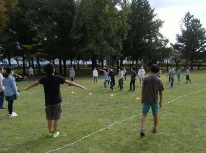 学年活動ドッジボールの様子です。大きな声を出さず、静かに取り組むなど、ルールを意識して遊びました。