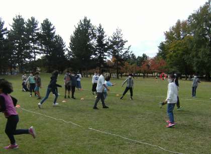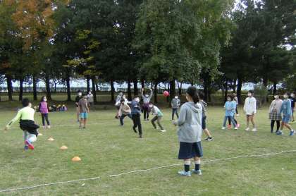 学年活動ドッジボールの様子です。大きな声を出さず、静かに取り組むなど、ルールを意識して遊びました。