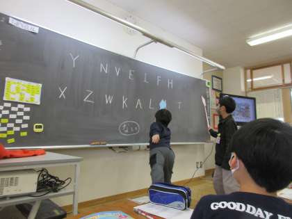3年生は、アルファベットを書いたり、発音したりしています。アルファベットの発音を聞いて見付けるゲームを行いました。「e」や「v」等、聞き分けが難しい音も集中して聞いていました。