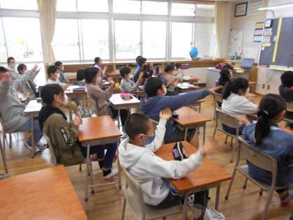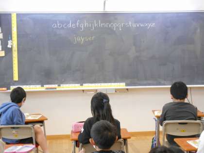 今日の外国語活動では、アルファベットの小文字を学習しました。発音しながら身振り手振りを付けて、体を動かしながら形と音を覚えることができました。授業の後半には、自分の選んだあ5つのアルファベットを使って、ビンゴゲームを楽しみました。耳を澄ませて、どの文字が発音されたのかを聞き取りました。