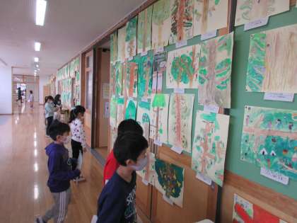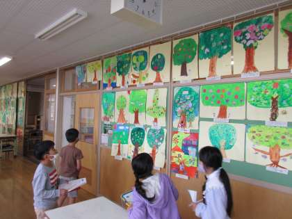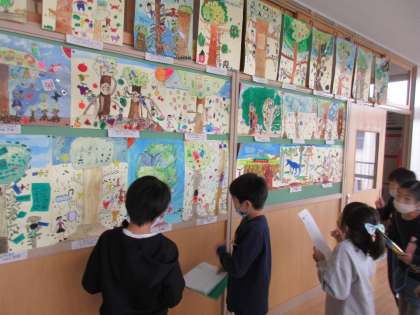 「○○のなる木」の鑑賞を行いました。各クラスに掲示された作品を見て、友達の作品のよさをたくさん見付けた子供たちです。
