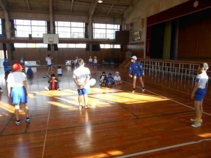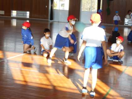 拳や手のひらを使って、ボールを床に打ち付けてラリーを楽しむネット型ゲームに初挑戦しました。まだうまくボールを打ち付けたり、ルールを理解したりはできませんでしたが、試しのゲームに取り組むことができました。