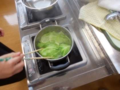 ゆでたての色鮮やかなキャベツの葉が、なんともおいしそうです。
