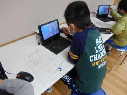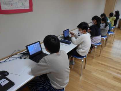 プログラミングソフトの「ビスケット」を使って動くカードを作っています。絵や文字を動かすための手順を考えて簡単なプログラムを組んでいます。