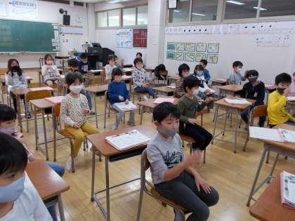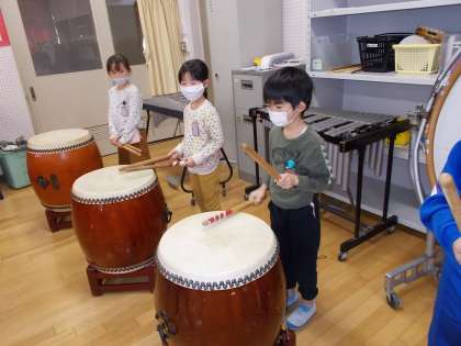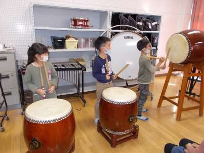 おまつりの音楽をつくりました。「ドンドコドコドンドコドコドン(うん)」「ドコドコドコドコドコドコドコドン」等、リズムカードを選択して組み合わせ、4小節の音楽を完成させました。初めての和太鼓でリズム打ちをすることにわくわくし、やる気いっぱいで挑戦しました。バチ使いに慣れると、いい力加減でいい音が出るようになりました。友達の演奏を聴いてリズムを真似して繰り返し、つなぎの部分では「いよっ」と掛け声も入れるなど、おまつり感や一体感が出てきて、楽しい音楽になりました。