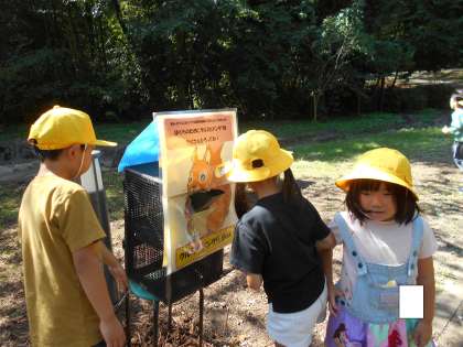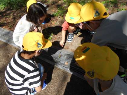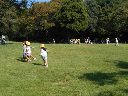 弁当を食べ終わった後は、芝生で遊んだり、虫を観察したりしました。ドングリやクルミ等の秋も見付けました。