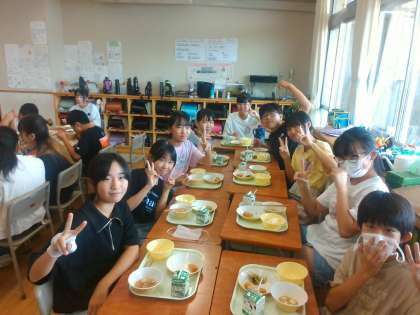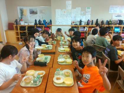 新しい班で給食を食べました。どの班も楽しく話をしながら食べています。
