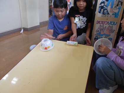 生活科の学習では、楽しく遊ぶことができる動くおもちゃを作っています。友達同士で相談したり、手伝ったりして製作しています。出来上がった子供たちは、楽しく遊ぶことができるか試しています。