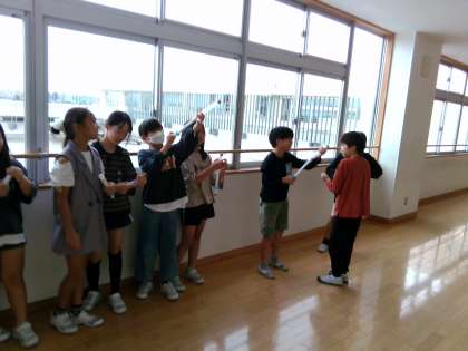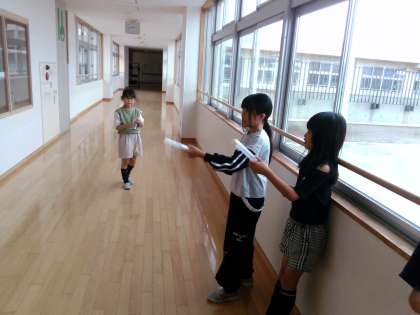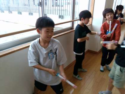 空気鉄砲で玉を飛ばし、とじこめた空気の性質について考えました。とじこめた空気の量によって飛ぶ距離が変わることに気付きました。