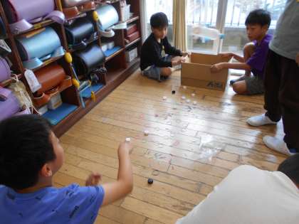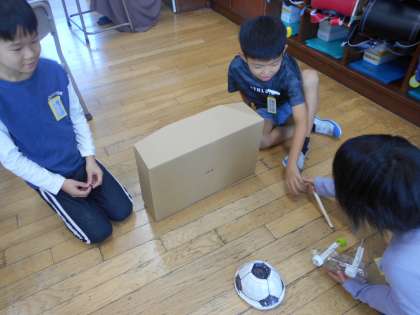 生活科の学習では、もっと楽しく遊ぶための工夫を考えています。「箱に入ったらクリアにしよう」「ゴールまでのコースを作ろう」と友達同士で話しながら、楽しく遊ぶことができる方法を探しています。