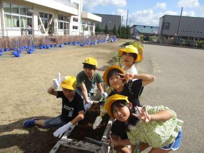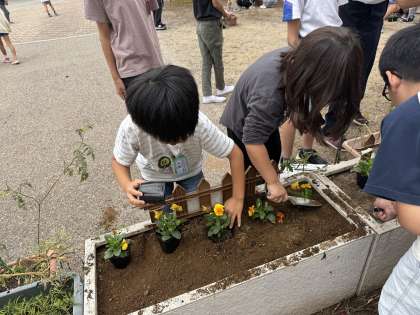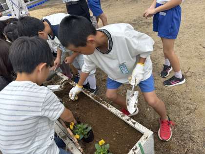 栽培委員会による活動で、花壇に2種類の花を植えました。クラスみんなで決めた花の色が見られるように、花壇をきれいにしたり、大事に苗を植えたりしました。これから毎日水やりを頑張りましょう。