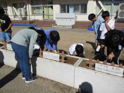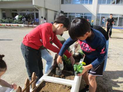 春に植えた花を撤去し、秋植えを行いました。パンジーやチューリップの球根を植え、さらに、各学級の看板も立てました。チューリップの球根は、あらかじめ各学級で何色の花を咲かせたいか相談をして決めた球根です。来年の春、美しい花を咲かせてくれるよう、大切に育てていきます。