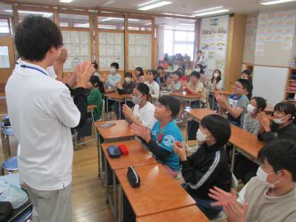 総合的な学習の時間の一環として、富山県立大学の学生と交流し、キャリア教育について学習しました。大学の様子やこれからがんばったらよいことなどを教えていただきました。子供たちは、和やかに交流していました。